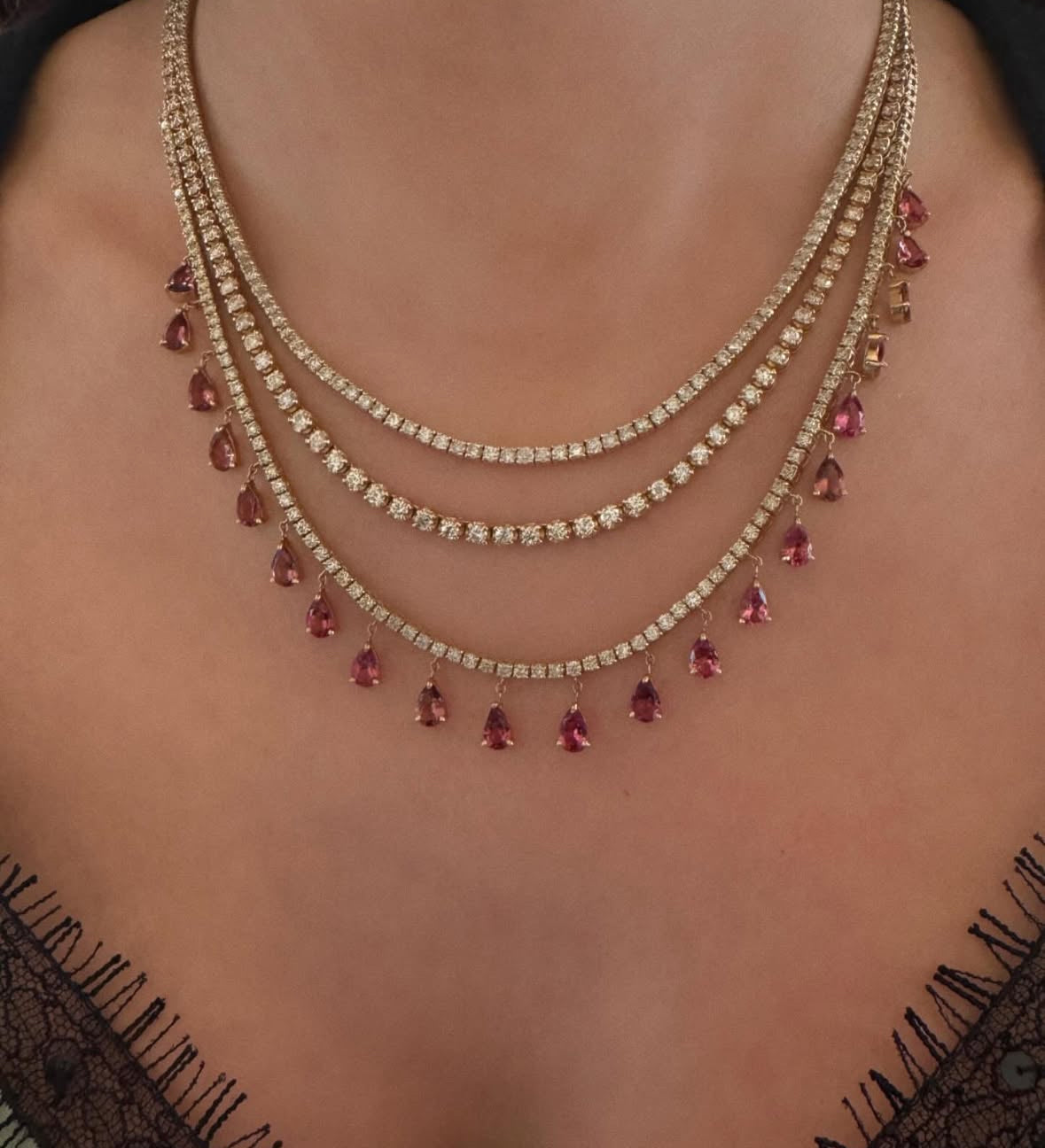 Diamond Pink Tourmaline Pear Dangle Tennis Necklace